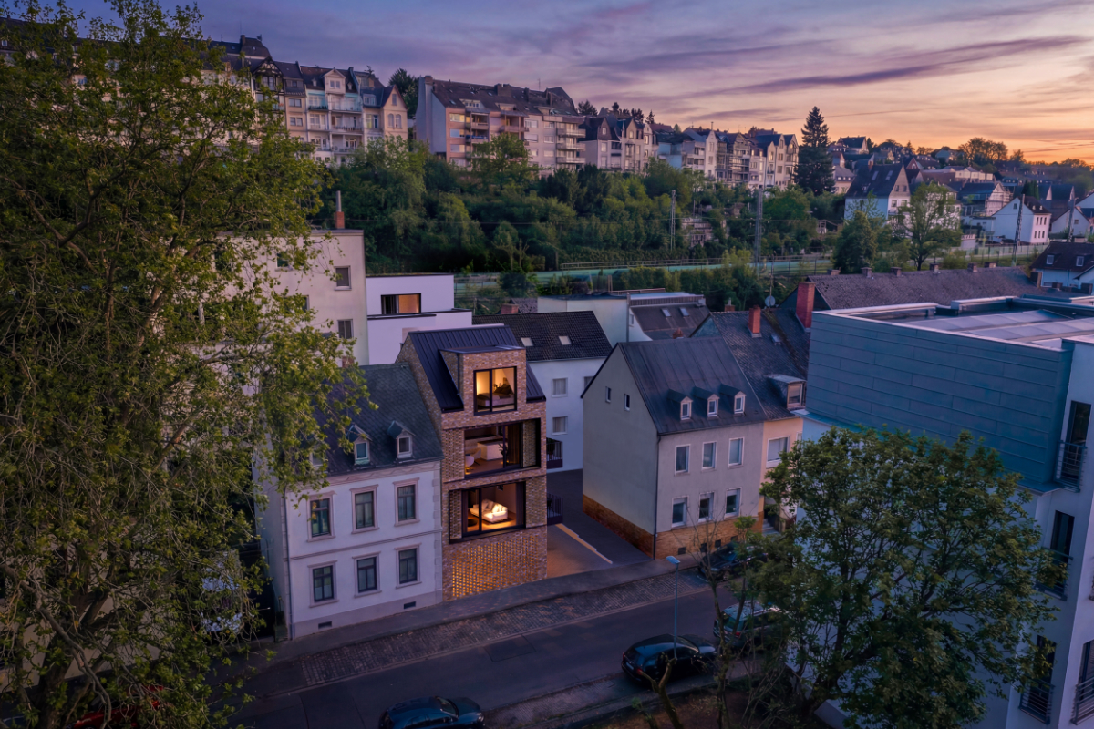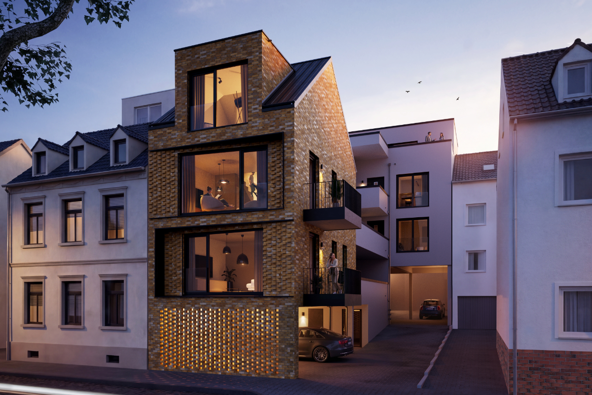 Bebauung und schließt präzise die bestehende Häuserzeile. Die fein nuancierte Klinkerfassade